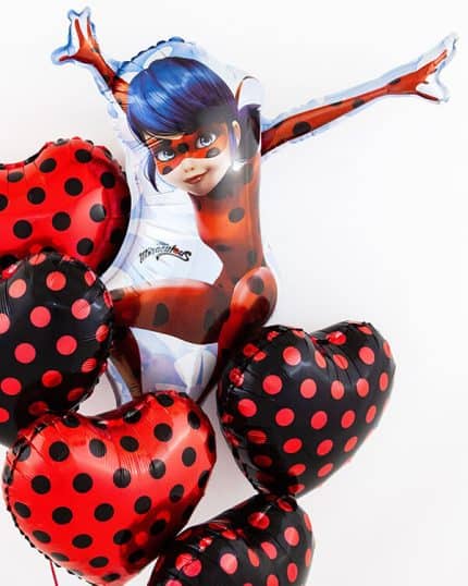 Воздушные шары комбинируют между собой. В больших, красивых связках героиня Леди Баг переплетается с другими элементами — цветами, сердцами и звездами. Это может быть одна крупная главная фигура, разбавленная латексными шариками красного и черного цветов. Они поднимают настроение на любом празднике.